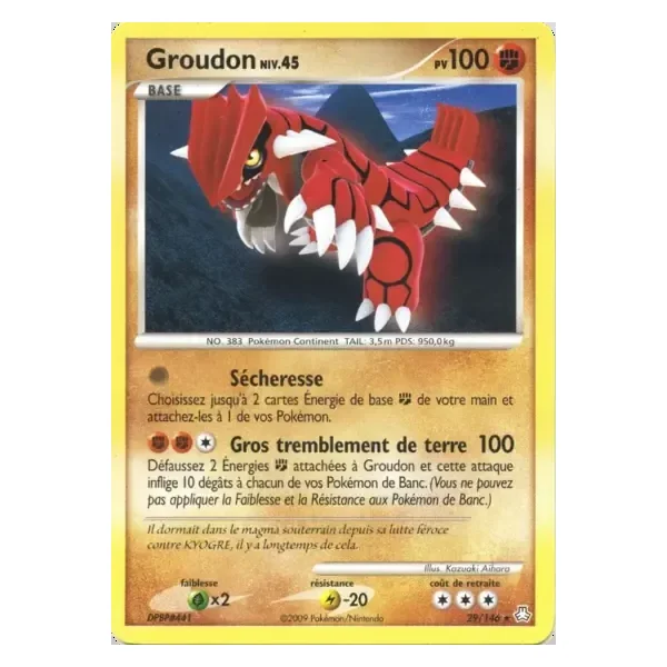 Découvrez Groudon (la029), une carte Pokémon de l’extension Eveil des Légendes, provenant du bloc Diamant & Perle. Idéale pour compléter votre collection, cette carte Rare plaira autant aux collectionneurs qu’aux joueurs.