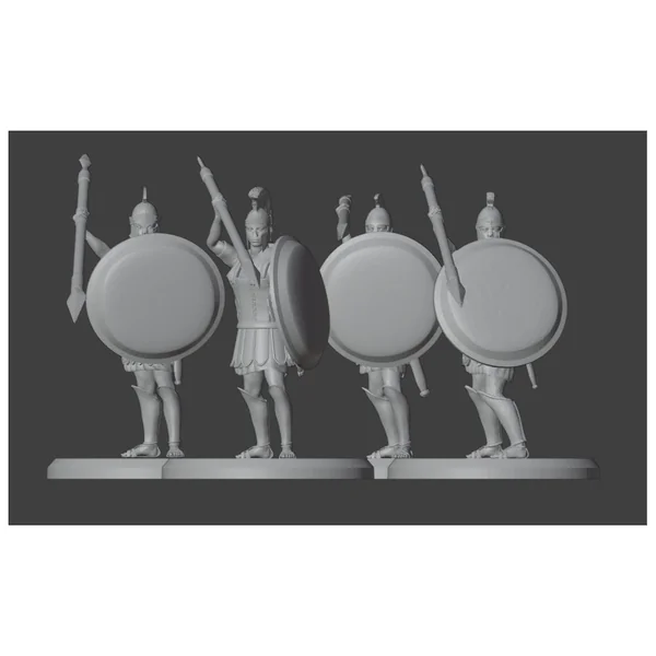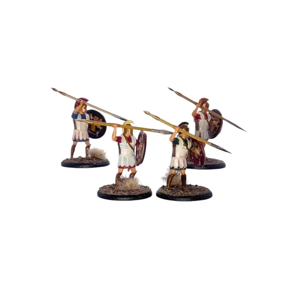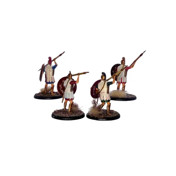 Vous trouverez 4 guerriers Hoplites prêts à tenir votre ligne de front face à tous vos adversaires antiques (Celtes, Perses, Romains …). Chacun d’entre eux est équipé d’un linothorax complété par un bouclier rond de grande taille ainsi que d’une lance (doris ou doru).