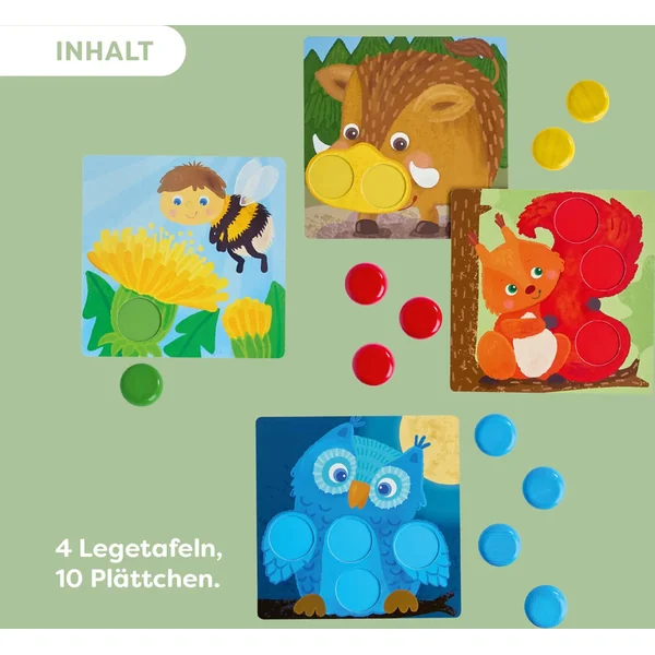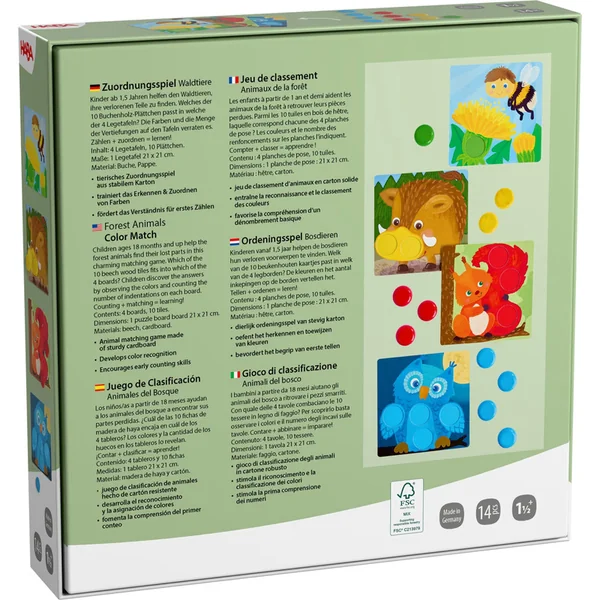 Le jeu se compose de quatre plateaux avec différentes cavités, dans lesquelles les enfants insèrent des pièces fabriquées en véritable bois de hêtre.