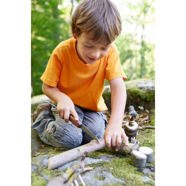 Lors des activités manuelles, un adulte doit toujours être à proximité des enfants. Grâce au couteau, les enfants apprendront à créer des personnages créatifs à partir de matériaux naturels tels que le bois, les glands ou les châtaignes. Travailler avec le couteau favorise la motricité fine, la concentration et la persévérance. Le couteau peut être facilement attaché à un mousqueton à l’aide d’une corde.