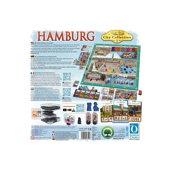 Hamburg est un jeu expert édité par Queen Games, jouable de 1 à 5 joueurs, dès 14 ans, pour des parties de 75 min environ.