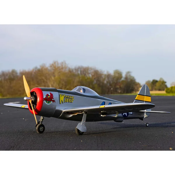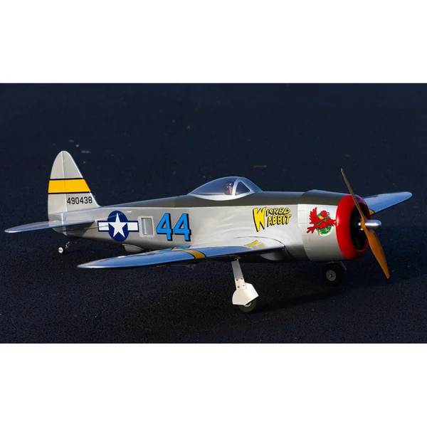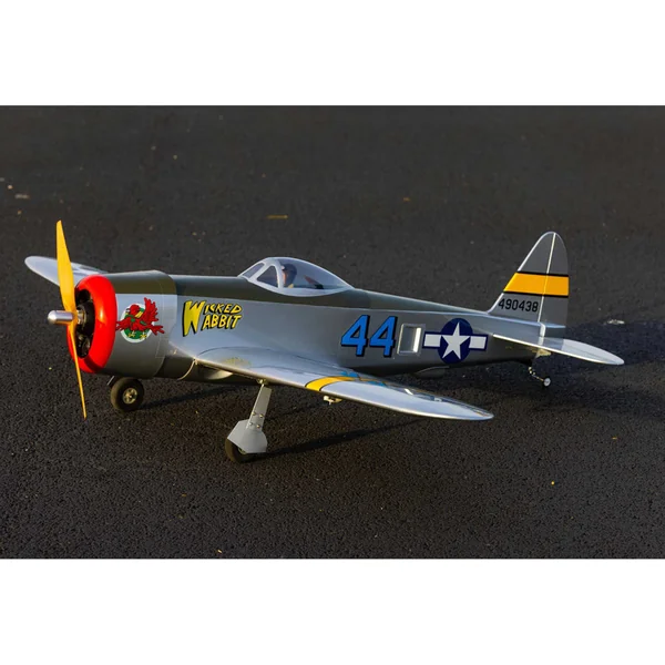 Hangar 9 propose un modèle RC P-47 Thunderbolt entièrement en bois, pratiquement équipé et presque prêt à l’emploi, qui est un kit standard à assembler selon les instructions. L’avantage de ce modèle est qu’il est équipé d’un moteur, de servos et d’un train d’atterrissage électrique rétractable. La construction légère en bois est principalement en contreplaqué et en balsa, les pièces sont recouvertes d’un film thermocollant UltraCote®. Lors de l’assemblage, vous devez coller la dérive, installer les tringles et compléter l’aile, qui se fixe au fuselage à l’aide de deux vis et d’un goupille. Les deux ensembles de décalcomanies inclus vous permettent de décorer votre modèle en camouflage « Wicked Wabbit » ou « Hun Hunter ». Le capot du moteur est en fibre de verre peint, facilement amovible et facilite l’accès à l’électronique et aux batteries. Le paquet comprend une hélice en bois 14×12 pour alimenter des batteries LiPo 4S.