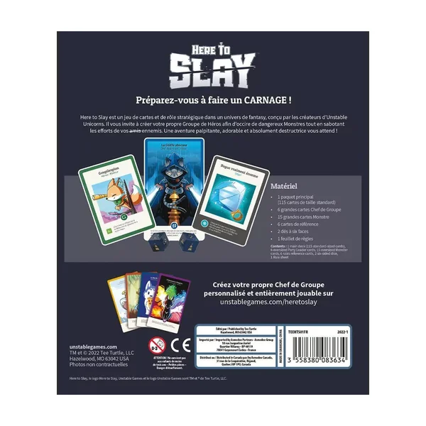 Dans Here to Slay, vous rassemblerez un groupe complet de héros pour tuer des monstres dangereux tout en évitant le sabotage de vos ennemis. Le jeu comprend également des objets que vous pouvez équiper pour vos héros, des cartes de défi 1V1 et des modificateurs de jet pour faire pencher la balance en votre faveur.