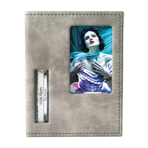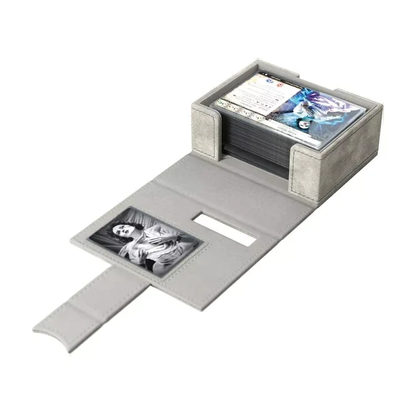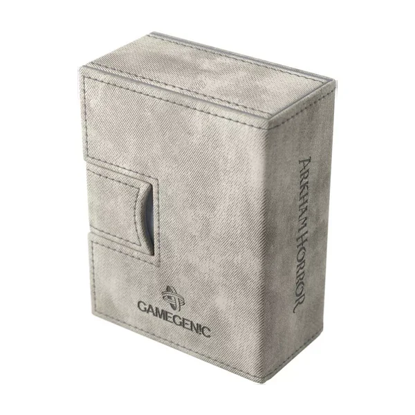 De petites encoches en bas permettent un accès pratique jusqu’à la dernière carte. Sans avoir besoin d’ouvrir la boîte, vous pouvez vérifier votre deck enquêteur au premier coup d’œil grâce aux découpes qui affichent le portrait, la classe, le nom et le trait du deck.