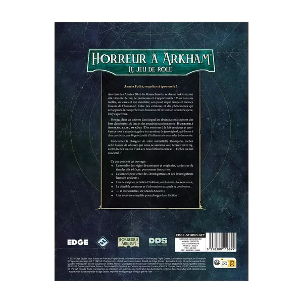 Horreur à Arkham : Le Jeu de Rôle – Manuel Essentiel est le livre de base pour le jeu de rôle Horreur à Arkham, édité par Edge utilisant le système DPS.