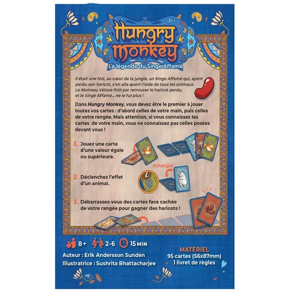 Découvrez la légende du Singe affamé au travers d’un jeu de cartes familial, rythmé et très malin ! Jouez vos cartes, déclenchez des effets, et soyez le premier à vous débarrasser de l’intégralité de vos cartes !