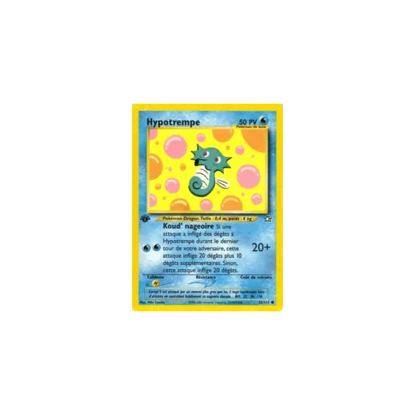 Découvrez Hypotrempe (ng062), une carte Pokémon de l’extension Neo Genesis, provenant du bloc Wizards. Idéale pour compléter votre collection, cette carte Commune plaira autant aux collectionneurs qu’aux joueurs.