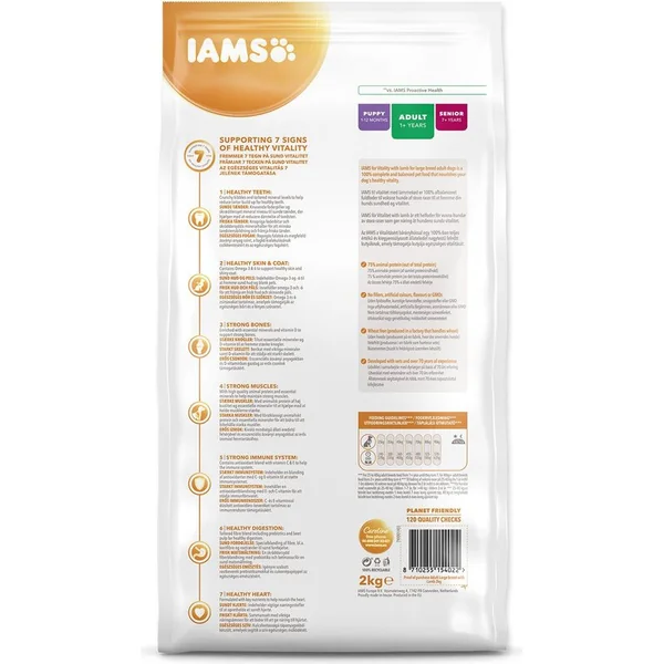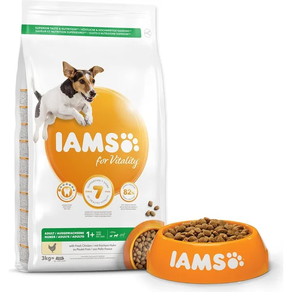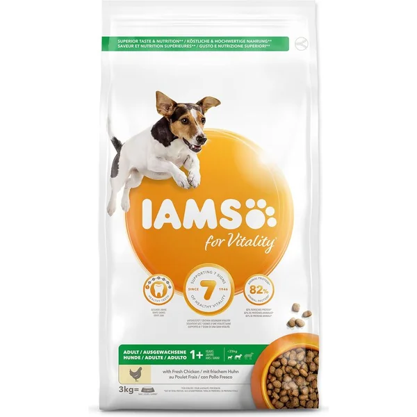 La nourriture IAMS for Vitality pour les chiens adultes de petites et moyennes races est une nourriture 100% complète et équilibrée, élaborée par des experts, qui plaira à votre animal et lui fera du bien. Notre nouvelle formule améliorée ??pour les chiens adultes avec de la viande de poulet frais est basée sur des protéines animales de haute qualité, soigneusement sélectionnées pour soutenir sept signes de vitalité saine chez le chien. Pour que votre chien soit en bonne santé, actif et plein d’énergie, nos délicieuses recettes contiennent jusqu’à 82% de protéines animales (sur la teneur totale en protéines).
