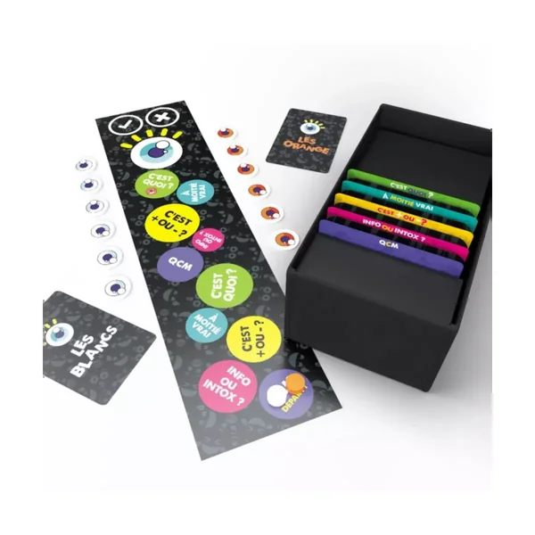 Bravez les questions et frayez-vous un chemin vers la victoire : la première équipe à atteindre l’œil remporte la partie ! Les joueurs rencontrent différentes catégories de questions en fonction de leur avancée sur le plateau.