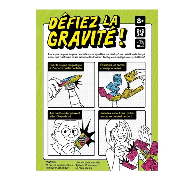 Il suffit de fixer la base magnétique sur n’importe quelle bouteille, puis d’équilibrer les cartes à tour de rôle. Si vous vous débarrassez de toutes vos cartes, vous êtes en sécurité… pour l’instant. Mais la gravité finira par vous rattraper ! Quelqu’un finira par renverser toutes les cartes, alors assurez-vous que ça ne soit pas vous !