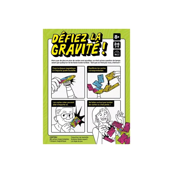 Instable contient : 20 cartes imperméables, 1 disque magnétique, 1 bouchon de bouteille adaptable, la règle du jeu.