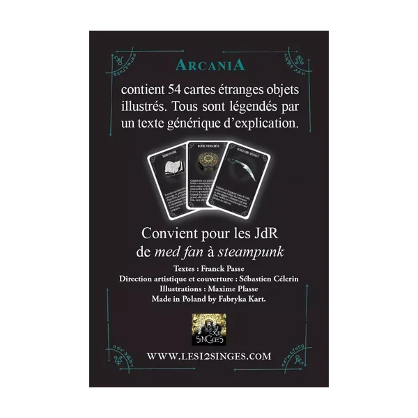 Arcania est un paquet de cartes contenant 54 nouveaux Arcana pour Into the Odd, mais pouvant également être utilisé avec tous les jeux de rôle fantastiques ou steampunk.