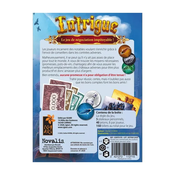 Intrigue est un jeu de société de négociation impitoyable pour 3 à 5 joueurs à partir de 14 ans, édité par Igiari.
