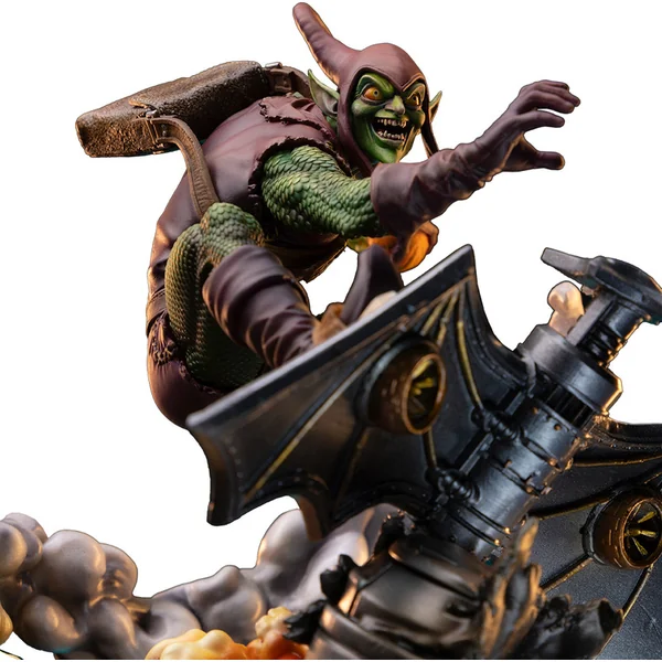 Le plus grand et le plus redouté ennemi de Spider-Man renaît sous la forme d’une magnifique figurine de collection de Iron Studios. Green Goblin, enveloppé dans une tunique et une capuche menaçantes, plane bas sur son célèbre planeur Goblin Glider, prêt à semer le chaos avec sa bombe emblématique en forme de citrouille. Son sourire malveillant et ses yeux jaunes perçants sont fixés sur sa cible, capturant parfaitement la pure folie qui anime Norman Osborn.
