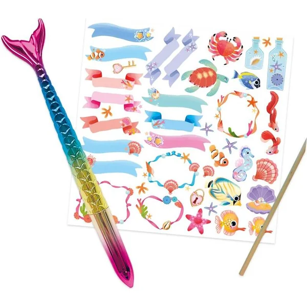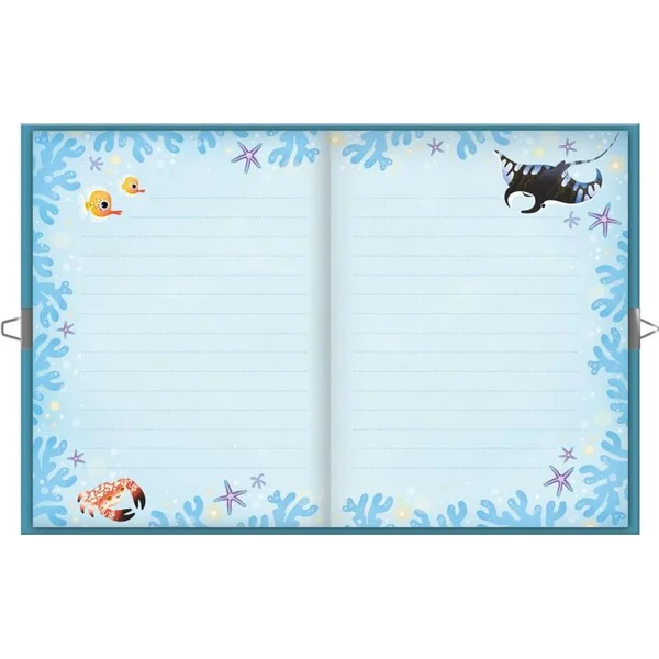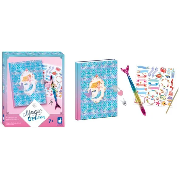 Le Creative Set Secret Notebook Magical Ocean de la marque française JANOD comprend un carnet de 96 pages avec un cadenas et deux clés. La couverture du carnet avec des écailles scintillantes est décorée d’une sirène et ses pages sont bleues. Le set comprend également une feuille d’autocollants marins et un stylo violet en forme de queue de sirène. Le carnet peut devenir un journal secret, un endroit pour des notes importantes ou un carnet de croquis.