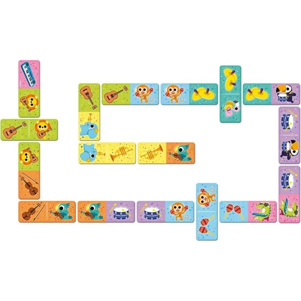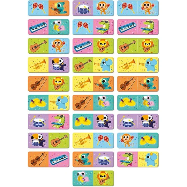 Ce jeu de domino contient 28 pièces et est à la fois amusant et éducatif. Associez soit le même animal soit son instrument de musique. Ce jeu se joue également avec un motif de dés au dos des figurines.