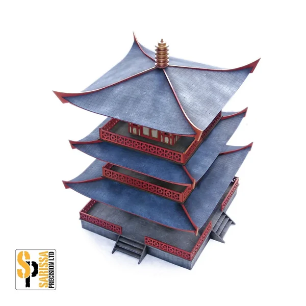 - 1 pagode en MDF et carton avec de nombreux détails gravés, étages superposables (chaque étage ajoutent environ 75mm) et un toit amovible.