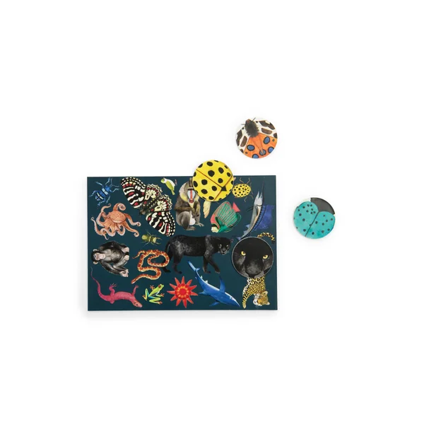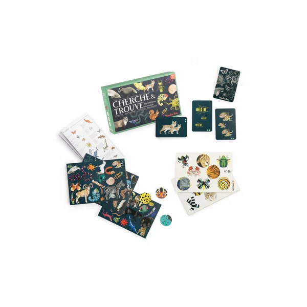 Cherche et trouve les animaux du monde le plus vite possible ! Pour pimenter le jeu et gagner plus de points, piochez une carte curiosité. A chaque partie, changez le plateau de jeu en modulant les 9 planches. Un poster avec le nom des animaux inclus.