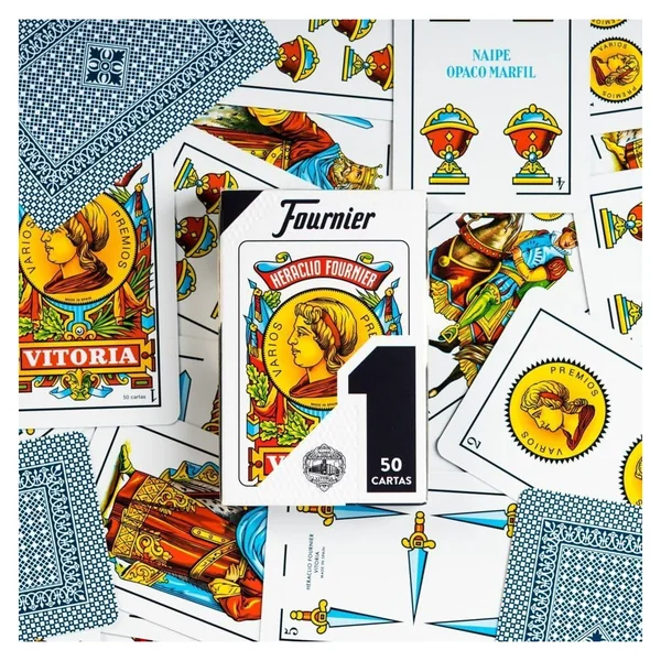 Jeu de 50 cartes espagnoles contenu dans un étui en carton. Dos bleu.