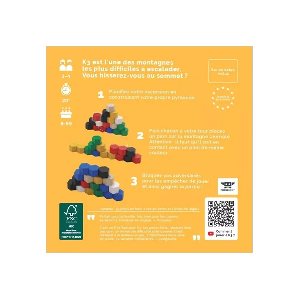 Attaquez-vous à l’ascension du K3 ! 55 pièces en bois multicolores, pour un jeu simple, accessible, et particulièrement tactique !