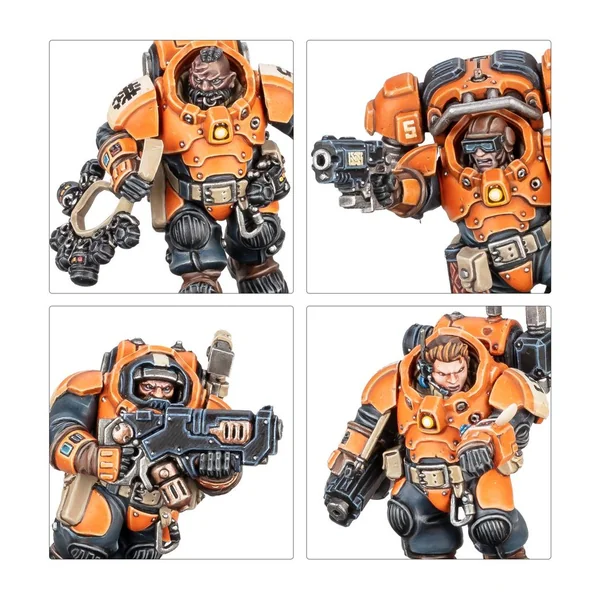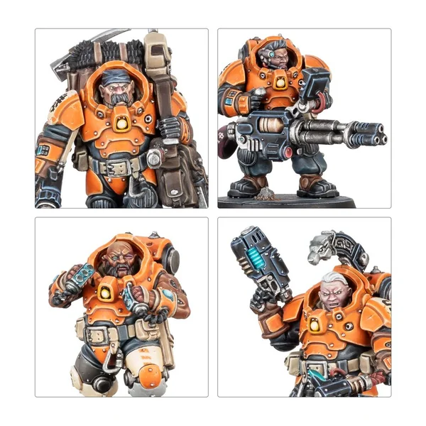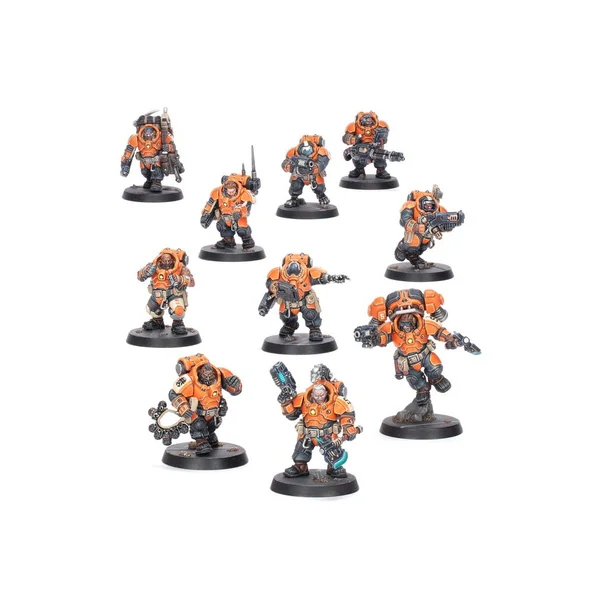 Ce kit en plastique permet d’assembler une escouade de 10 Récupérateurs trekogs, des prospecteurs Cognats qui opèrent dans les conditions les plus périlleuses. Ces figurines peuvent être utilisées en tant qu’agents dans les parties de Kill Team ou être incorporées au sein des armées des Ligues de Votann dans les parties de Warhammer 40,000. Le kit contient nombre d’options et d’accessoires pour personnaliser votre kill team, ainsi que des éléments pour assembler des spécialistes, comme le Guerrier à Réacteur Dorsal, ou encore le Kognitâar réfléchi.