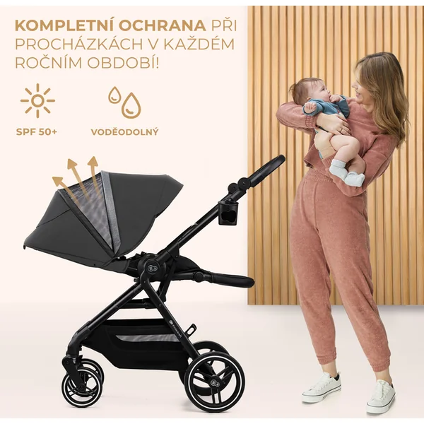 La capote de la poussette est grande et imperméable, avec un filtre UPF50+. Elle possède un panneau de ventilation supplémentaire et une fenêtre pour le contact avec l’enfant, à travers laquelle vous pouvez voir ce que fait votre enfant.