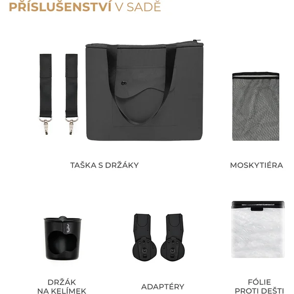 La poussette est également livrée avec toute une gamme d’accessoires pratiques, tels qu’un filet anti-insectes, une housse de pluie, un porte-gobelet, un sac pour la poignée des parents et des adaptateurs pour siège auto.