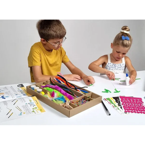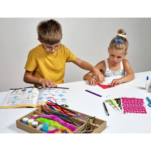 Ensemble avec de nombreux outils, accessoires et matériaux artisanaux pour les enfants créatifs à partir de 4 ans !