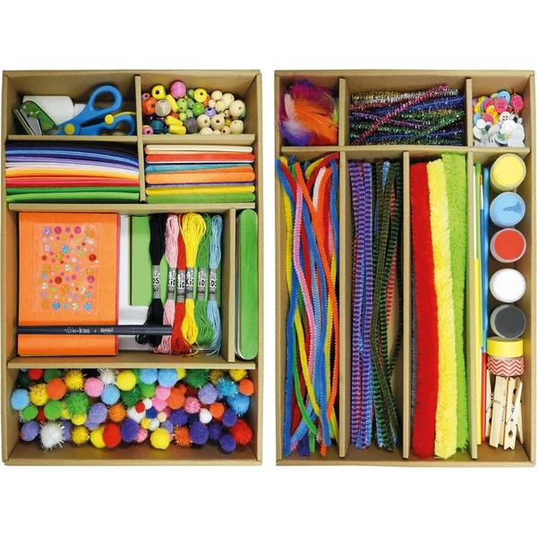 Contient plus de 800 accessoires et outils différents y compris des ciseaux, des feuilles de papier coloré, du fil de coton, des bâtonnets en bois, des boutons, des éléments de fixation en laiton, de la feutrine, des marqueurs, de la peinture, etc.