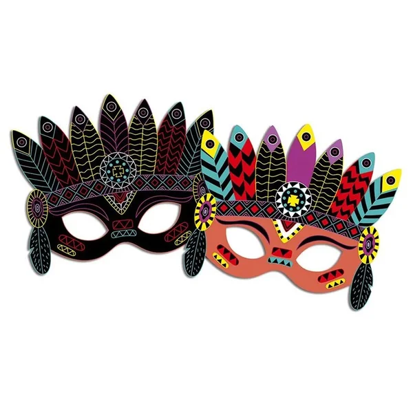 5 masques à gratter grâce à un outil en bois, 5 élastiques et 1 livret avec modèles et instructions.