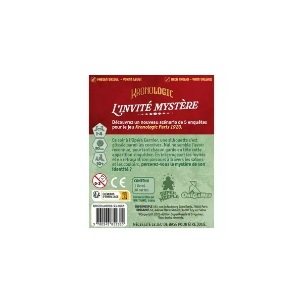 Kronologic – Paris 1920 : L’Invité Mystère Scénario 6 est une extension jouable de 1 à 4 joueurs dès 10 ans pour des parties de 30 minutes, co-édité par Origames et Super Meeple.
