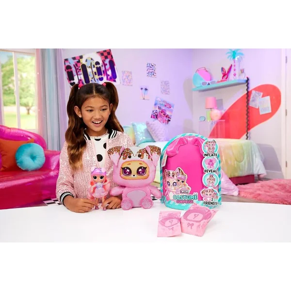 Préparez-vous à déballer la plus grande surprise avec le nouveau L.O.L. Surprise Costume Tweens. D’abord, déchirez la fermeture éclair au bas de l’emballage et soulevez le couvercle rose extérieur pour révéler le papier d’emballage mystérieux. Regardez le papier devenir de plus en plus grand et plein, et quand il est complètement gonflé, déchirez le papier pour révéler votre adorable costume de chien rose. Mais attendez, les surprises ne s’arrêtent pas là. Ouvrez la fermeture velcro à l’arrière de la tête du chaton et révélez la magnifique poupée Ali Dance Tweens cachée à l’intérieur.