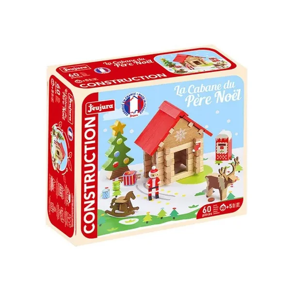 La Cabane du Père Noël 60 pièces : jeu de construction en bois brut et teinté avec une notice de montage, un tapis de jeu et de nombreux accessoires.
