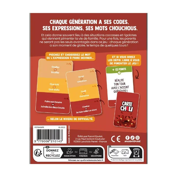 Vous aimez prendre des risques ? Avant votre tour, vous pouvez piocher une carte Chili à vos risques et périls, en un tour elles renversent la partie ! Se boucher le nez, prendre un accent, etc.