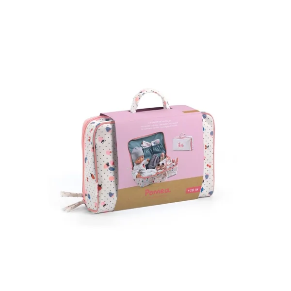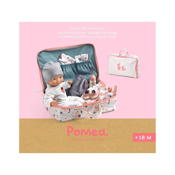On part en voyage ! Une jolie valise « prête à offrir » pour découvrir le tendre univers POMEA. Baby Vanille a tous les accessoires pour partir sereinement en vacances. Un pyjama et son bonnet, une tenue de rechange, une couche, un biberon et un bavoir complètent la valise. Baby Vanille est légère et sa taille (32 cm) est parfaitement adaptée aux petits bras. Son corps souple est imprimé d’un joli body et permet de la positionner comme un vrai bébé. Son visage, ses bras et ses jambes sont en vinyle très doux, agréable au toucher. Une tenue de rechange composée d’un haut avec une fermeture devant croisée pour faciliter l’habillage, d’un bloomer et de chaussons.