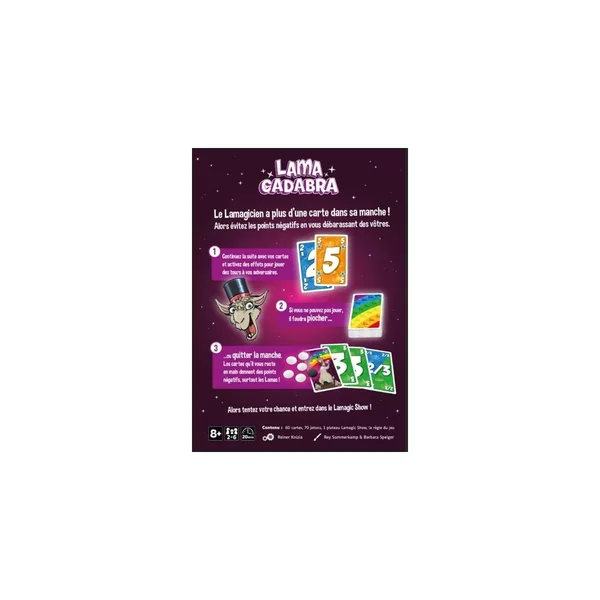 Lama Cadabra est un jeu d’ambiance familial de cartes et de défausse pour des parties de 20 minutes environ de 2 à 6 joueurs dès 8 ans, édité par Gigamic.