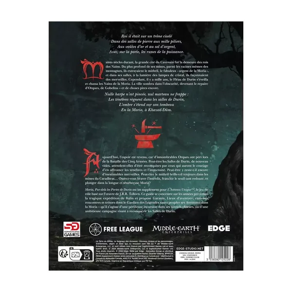 Se déroulant avant la funeste expédition de Balin, ce supplément renferme une véritable mine de Patrons, de Lieux emblématiques, d’ennemis, de rencontres et de trésors que le Maître du Jeu pourra utiliser pour créer ses propres aventures dans la Moria – qu’il s’agisse d’un unique périple désespéré dans les ténèbres ou d’une vaste campagne visant à reconquérir les Salles de Durin.