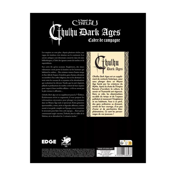 Cthulhu Dark Ages est un supplément pour la 7e Édition de l’Appel de Cthulhu. Entièrement révisé et augmenté, il vous propose les informations nécessaires pour plonger vos joueuses dans un Moyen ge rude et éprouvant. Entre grimoires épouvantables, contes, récits et légendes affreuses, combat monté et un guide complet sur l’époque, vous y trouverez le nécessaire pour faire vivre cette époque… Ainsi qu’une communauté anglo-saxonne, Totburh, dans la vallée de la Sabrine, où se déroulent les 3 scénarios inclus !