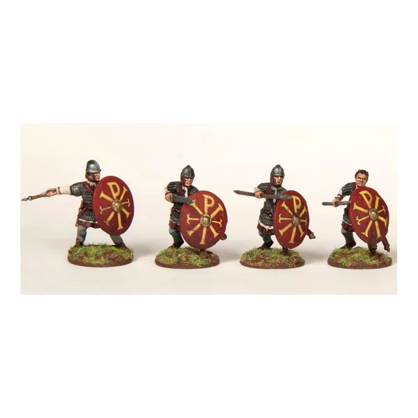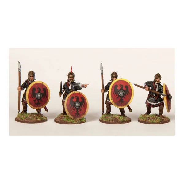 Ce set en plastique dur vous permet de construire jusqu’à 24 légionnaires avec spatha, lance, et plumbata ainsi que deux types d’étendards et un commandement complet. Ce set offre trois options de casques différents : les styles Niedebieber, ridge, et Spangenhelm ainsi que la casquette en fourrure « Panonnian ». Il existe deux types d’options de cimier et des têtes supplémentaires pour créer un commandement. Cet ensemble peut également être utilisé pour créer des guerriers en armure pour de nombreuses armées de l’âge sombre, notamment les Goths, les Bourguignons, les Saxons, les Francs et les Romano-Britanniques.