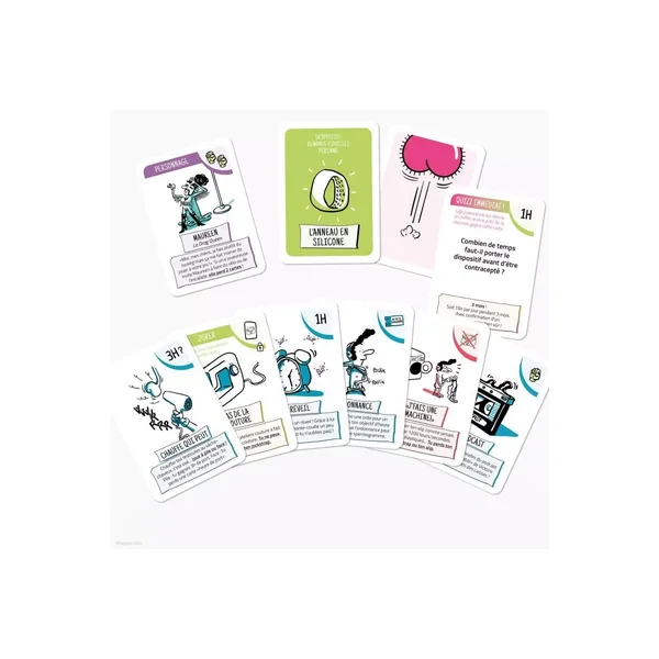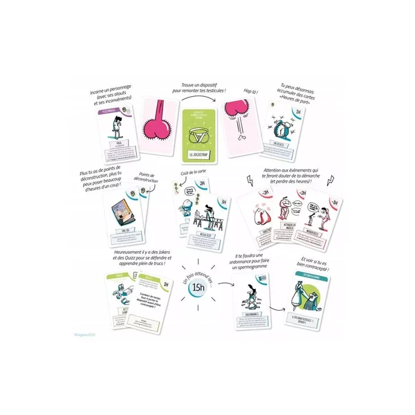 À la manière d’un mille burnes bornes, chacun·e doit parvenir à remonter ses testicules grâce à une carte “dispositif contraceptif” (= feu vert) et cumuler des cartes “heures de port” pour les maintenir au chaud pendant 15 heures, en évitant les coups bas de ses adversaires. Le premier joueur à atteindre les 15 heures de port, pioche une carte spermogramme et découvre son résultat : Moins d’un million de spermatozoïdes, c’est gagné, sinon, on repart pour un tour.