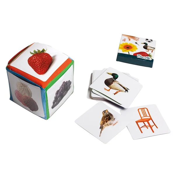 Les 60 photographies qui peuvent être insérées dans les pochettes du dé correspondent aux premiers noms appris par les tout-petits en général.