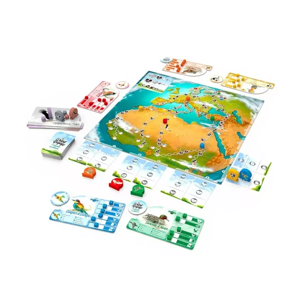 A la fin de l’été, les oiseaux préparent leur migration annuelle. Des millions d’oiseaux de toutes tailles quittent l’Europe et s’envolent vers l’Afrique où ils passeront l’hiver. Chaque joueur choisit une espèce migratrice : hirondelle, milan noir, cigogne, rougequeue à front blanc, huppe fasciée, guêpier, bécasse ou sarcelle d’hiver. Les joueurs tenteront d’être les premiers à mener leur espèce à destination.