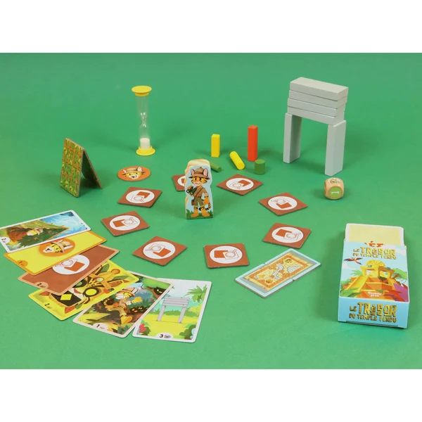 Contenu : 1 pion Aventurier – 1 jeton Chance – 10 tuiles Exploration – 74 cartes Défi – 2 tuiles Abri – 1 dé en bois – 1 sablier – 6 blocs Temple en bois – 5 formes Masque en bois