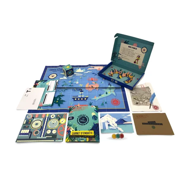 L’enquête contient : 1 fiche mission, 1 lettre de la directrice, 1 dé-codeur, 1 carnet d’enquête de 10 énigmes, 1 carte postale, 1 carte d’expédition, 1 rapport d’enquête, 1 défi créatif, 1 enveloppe préaffranchie.