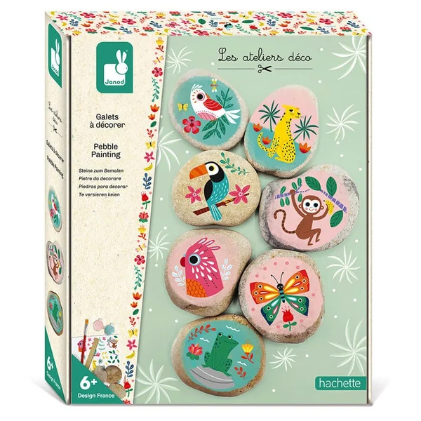 7 vrais galets à décorer à l’aide d’ 1 planche de transfert, 1 bâtonnet en bois, 2 godets de peinture, 1 pinceau et 1 livret avec modèles et instructions. Il suffit de peindre le galet dans un 1er temps, puis d’appliquer le transfert en appuyant bien avec le bâtonnet en bois. Galet : 4 x 6 x 2 cm. Cette activité créative développe : la motricité, la réflexion et l’application. Dès 6 ans.