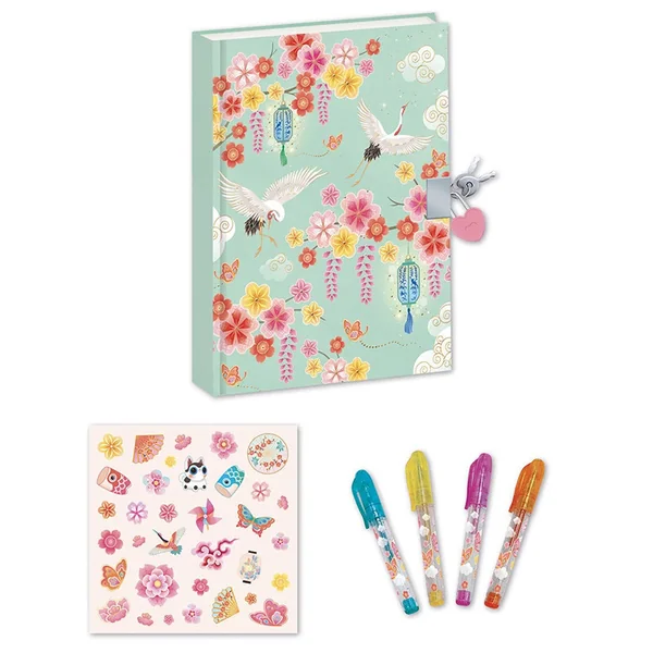Mais ce n’est pas qu’un journal intime, c’est aussi une activité créative idéale pour s’exprimer sans limites grâce à des pages lignées et illustrées. Une planche de stickers et 4 mini stylos gel pailletés accompagnent ce carnet : chaque page devient un vrai terrain de jeu pour la créativité ! Enfin, un cadenas en forme de cœur et son duo de clés veillent à ce que les secrets restent bien à l’abri. Chaque page est un havre de paix où la nature du Japon veille sur les secrets et les rêves les plus précieux.