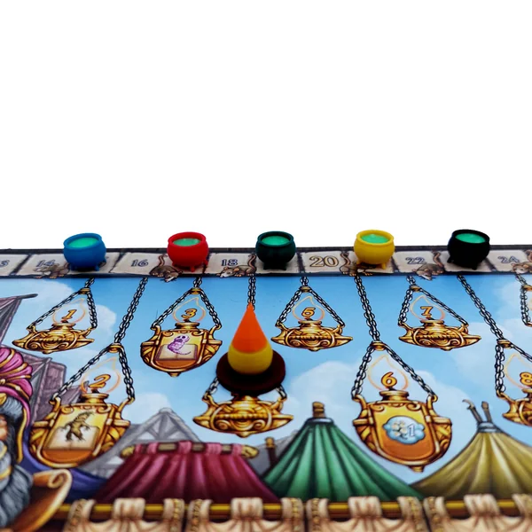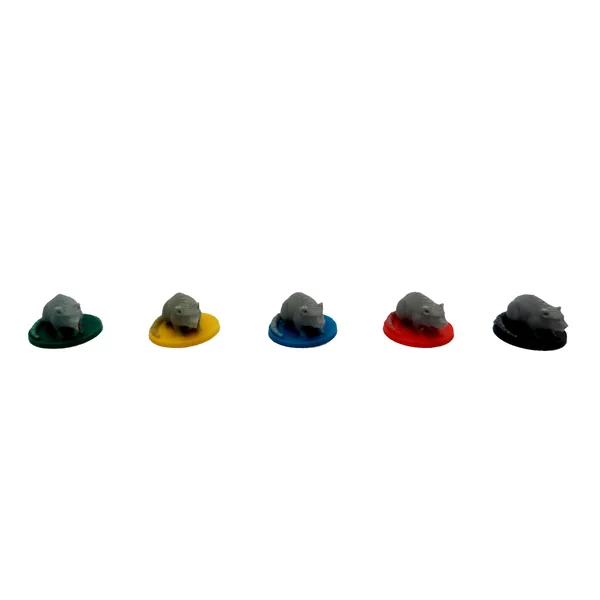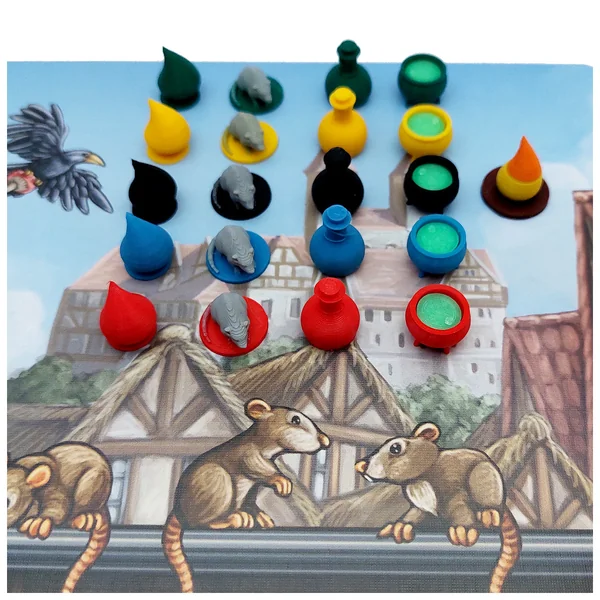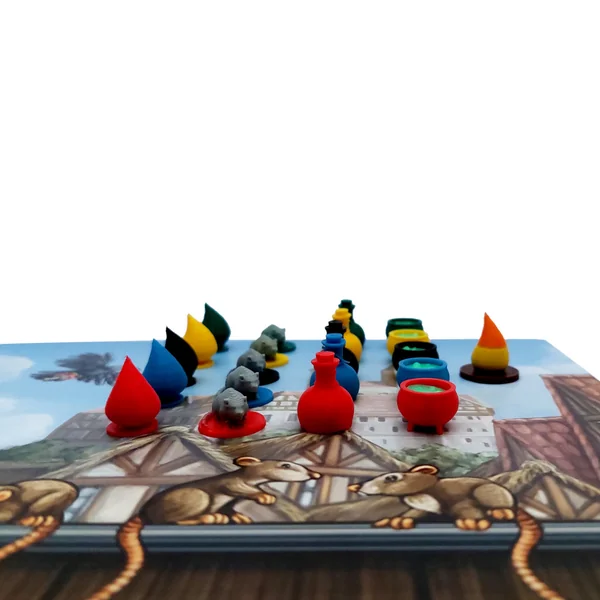 10 gouttes (2 par joueur), 5 potions pour l’extension les alchimistes, 5 chaudrons, 5 rats ainsi qu’un jeton flamme.