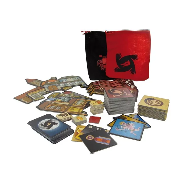 Les loups-garous de Thiercelieux : Le Pacte contient : 33 personnages différents, 47 cartes personnages, 29 jetons « rôles visibles », 36 cartes événements, 14 bâtiments, 2 sacs de rangement.