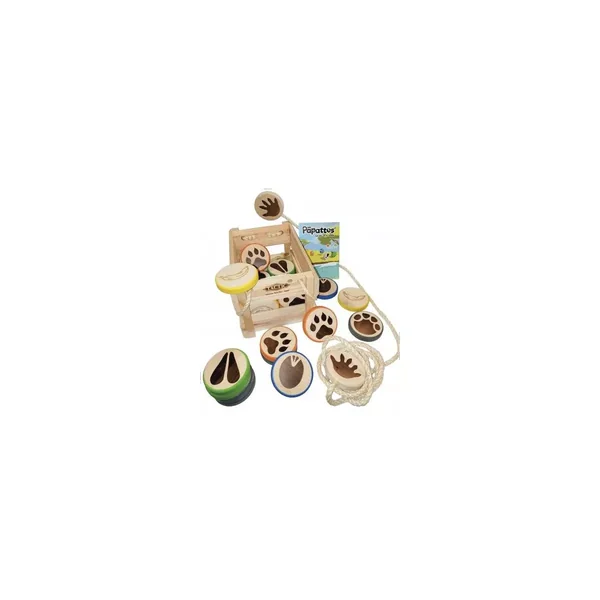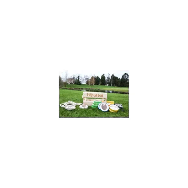 Le jeu Les Papattes contient une corde, 32 palets en bois (4 par animal), 8 bananes en bois et une règle du jeu. Pour jouer, il faut installer la corde à quelques mètres des joueurs, puis chacun choisit son animal et reçoit 4 palets et une banane de la même couleur.