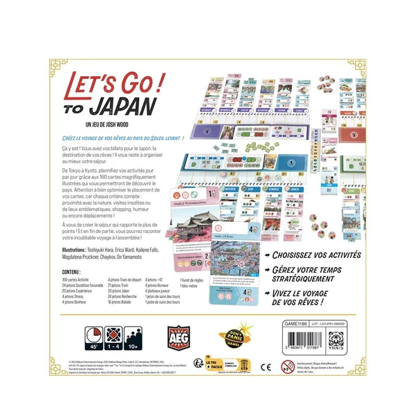 De Tokyo à Kyoto, planifiez vos activités jour par jour grâce aux 160 cartes magnifiquement illustrées qui vous permettront de découvrir le pays. Attention à bien optimiser le placement de vos cartes, car chaque critère compte : proximité avec la nature, visites insolites ou de lieux emblématiques, shopping, humeur ou encore déplacements ! À vous de créer le séjour qui rapporte le plus de points ! Et en fin de partie, vous pourrez raconter votre inoubliable voyage à l’assemblée !